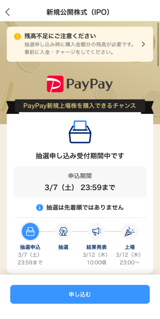 にチャージしていれば、その残高(PayPayマネー)でIPO抽選に参加できます。